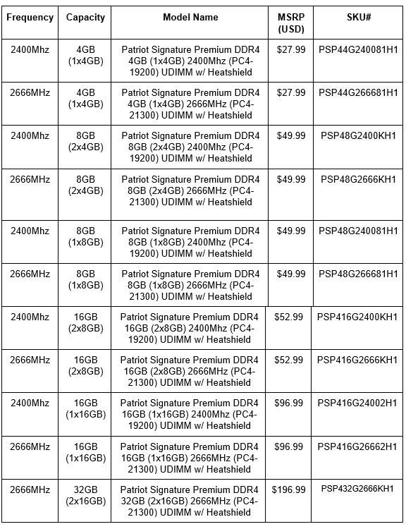 “Estamos encantados de presentar esta nueva y emocionante línea a los usuarios e integradores de computadoras”, dijo Roger Shinmoto, Vicepresidente de Patriot. “La línea de productos UDIMM con memoria de DDR4 de Signature Premium ofrece lo que más necesitan los consumidores: una DRAM de excelente apariencia respaldada por un rendimiento sólido y un buen precio”.