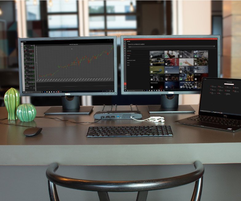 El UD-6950H es una actualización integral para computadoras portátiles o de escritorio con Windows. Para proporcionar a los usuarios la máxima flexibilidad con los monitores que se conectan, la base ofrece dos DisplayPort y dos salidas HDMI para duplicar o extender un escritorio de Windows hasta dos monitores externos. La capacidad de monitor dual permite a los usuarios realizar múltiples tareas en varias pantallas. El UD-6950H admite monitores desde 720p hasta 4K. Tanto las dos salidas DisplayPort como las dos HDMI son compatibles con versiones anteriores, lo que permite la interoperabilidad con las especificaciones anteriores de DisplayPort / HDMI.