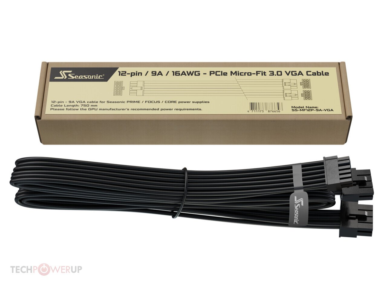 Seasonic cree que su cable es una combinación perfecta para las tarjetas gráficas de la serie GeForce RTX 30 de NVIDIA. El cable utiliza alambres de 16 AWG. Cada pin de 12 V del conector tiene una corriente nominal de 9 A, lo que significa que el cable es capaz de transportar hasta 540 W de potencia. En un extremo del cable hay dos conectores de 12 V de 8 pines (que se conectan al plano posterior modular de 12 V de su fuente de alimentación), y en el otro hay un conector de 12 pines. El cable tiene 75 cm de longitud. El cable es compatible con las PSU modulares / semimodulares de las series Prime, Focus y Core de la empresa.