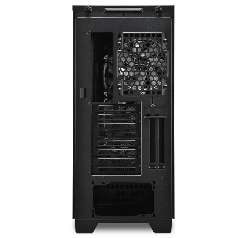 El interior del CA300T está generosamente dimensionado y provisto de un diseño bien pensado para sistemas complejos y grandes piezas de hardware. Se pueden alojar tarjetas gráficas con una longitud de hasta 42,5 cm, así como fuentes de alimentación con una longitud de 24 cm o refrigeradores de CPU con una altura de 16,5 cm. Además, hasta siete unidades de almacenamiento de 2,5 “o cuatro de 3,5” pueden encontrar espacio dentro de la caja grande.