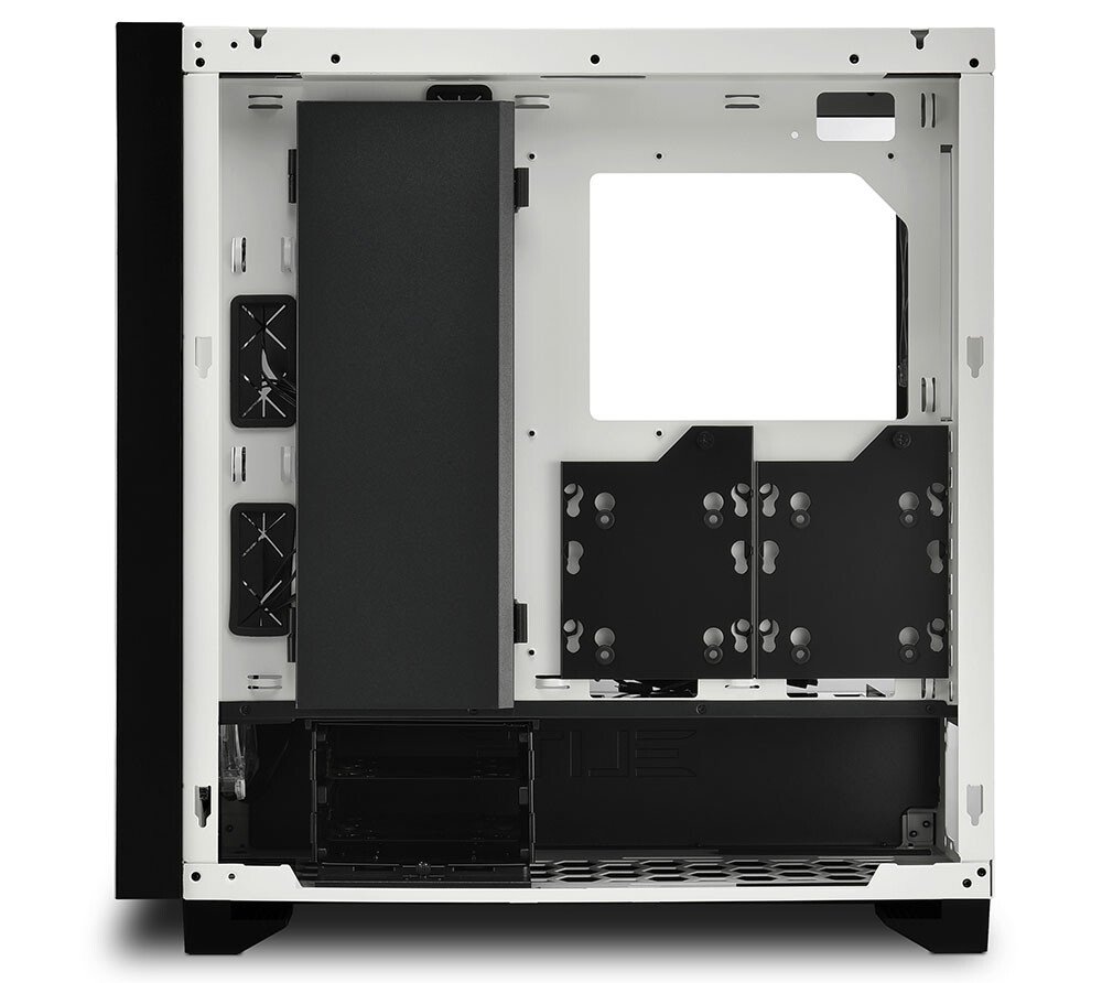 Para que los componentes instalados se puedan presentar de la mejor manera, el CA300T está equipado con dos paneles laterales de vidrio templado. Estos están libres de tornillos visibles en su superficie y se pueden colocar fácilmente en el marco de la carcasa en unos simples pasos. En el lado izquierdo, el vidrio es totalmente transparente, lo que brinda una vista completa del interior de la caja y el hardware instalado. El panel lateral derecho está teñido de negro en el extremo inferior para ocultar el túnel de suministro de energía detrás de él. Los SSD con elementos RGB o los imponentes HDD seguirán teniendo éxito. Dentro de la caja también hay un compartimiento con bisagras en el que los cables se pueden guardar y así esconder.