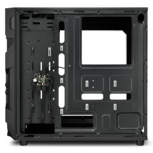 Para proteger el hardware de los depósitos de polvo, Sharkoon ha incorporado filtros de polvo que cubren áreas de entrada de aire. Estos pueden ser removidos para facilitar la limpieza. A pesar del tamaño compacto de la carcasa, no se deben hacer sacrificios considerables al configurar el sistema de hardware. En el interior, hay espacio suficiente para tarjetas gráficas con una longitud de hasta 37,5 cm, así como hasta cuatro SSD, hasta tres HDD y una unidad óptica.