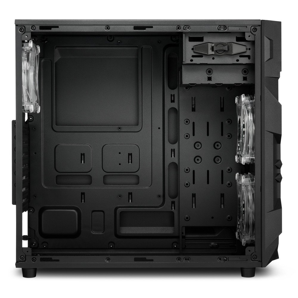 Para proteger el hardware de los depósitos de polvo, Sharkoon ha incorporado filtros de polvo que cubren áreas de entrada de aire. Estos pueden ser removidos para facilitar la limpieza. A pesar del tamaño compacto de la carcasa, no se deben hacer sacrificios considerables al configurar el sistema de hardware. En el interior, hay espacio suficiente para tarjetas gráficas con una longitud de hasta 37,5 cm, así como hasta cuatro SSD, hasta tres HDD y una unidad óptica.