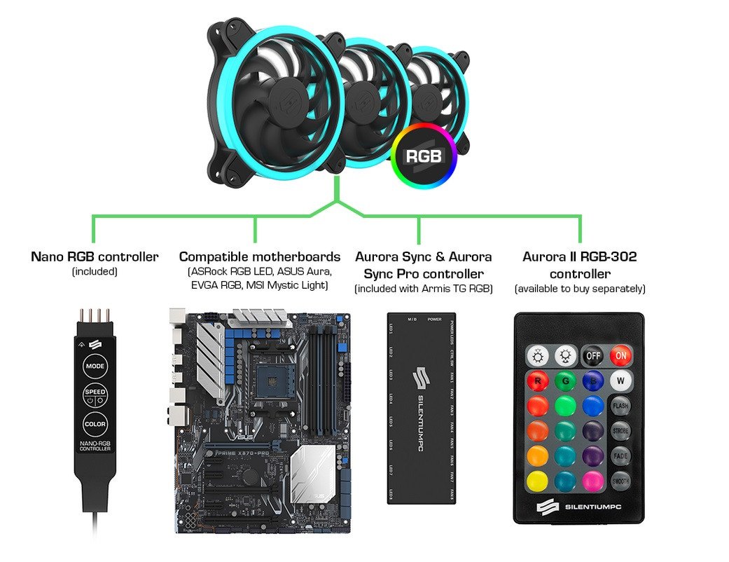 Primero, manualmente, usando el controlador Nano RGB incluido, que tiene varios modos predefinidos, desde rayos constantes, pasando por un cambio de color lento y gradual y respiración hasta estroboscópicos agresivos. Los botones adicionales aceleran o ralentizan cada uno de los efectos y también pueden apagar la iluminación por completo. La siguiente opción es usar los controladores patentados SilentiumPC Aurora Sync y Sync PRO preinstalados en los casos seleccionados de Armis.