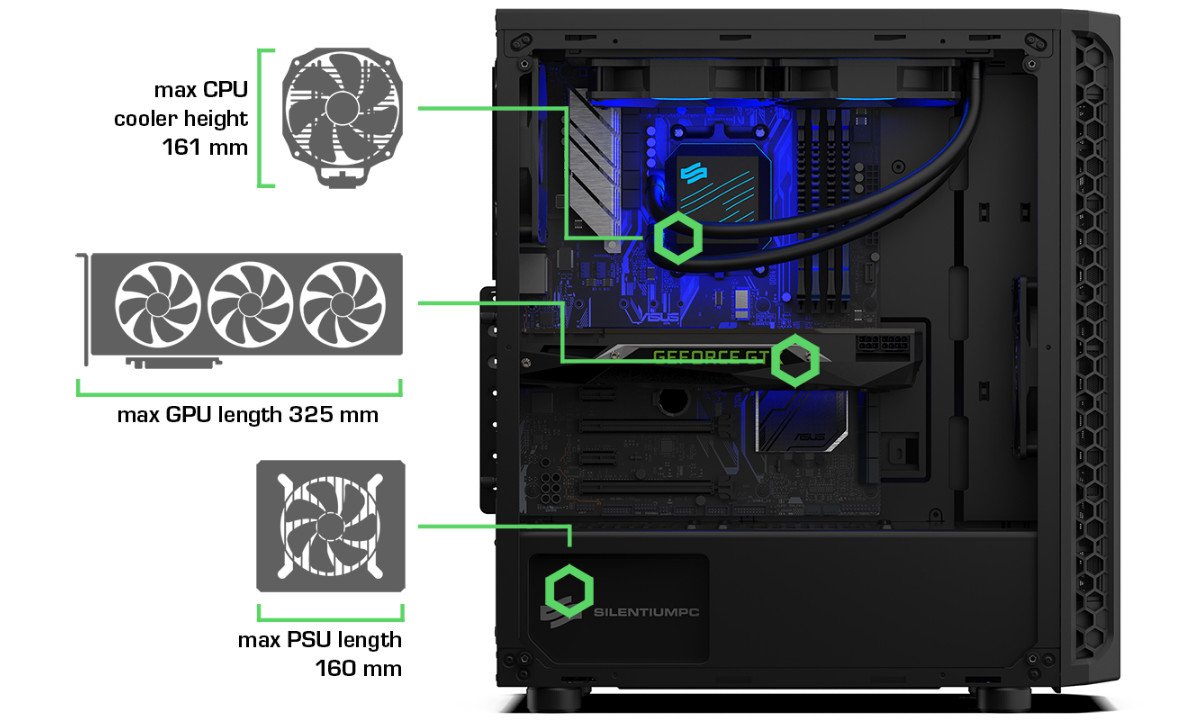 En términos de funcionalidad, este chasis se creó teniendo en cuenta la práctica final con un diseño interno radicalmente simplificado para facilitar la instalación y el mantenimiento. El chasis Signum SG1 es compatible con las placas principales ATX, microATX y mini-ITX y ofrece un amplio espacio para las últimas tarjetas VGA con una longitud de hasta 325 mm, así como enfriadores de aire con una altura máxima de 161 mm. Los usuarios pueden instalar sistemas de refrigeración por agua All-in-One con 120/240 en la parte superior y 120/240, así como 360 radiadores en la parte frontal.