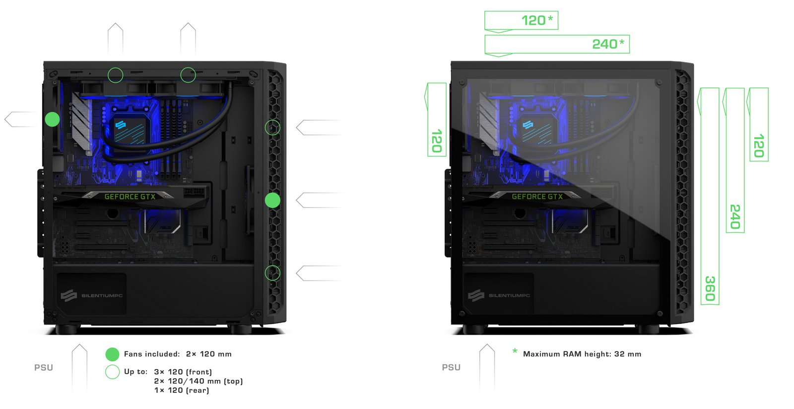 El flujo de aire adecuado se asegura utilizando la distribución de doble cámara, así como grandes salidas de aire en la parte frontal y superior de la caja. Dependiendo de la versión de la caja del Signum SG1, uno o dos ventiladores Sigma HP de 120 mm están preinstalados con la opción de ampliar hasta 8 ventiladores en total.