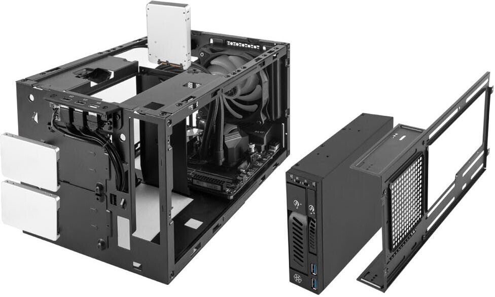 Silverstone presentó hoy una nueva e innovadora caja Mini-ITX tipo cubo, la Sugo 14 (modelo: SST-SG14B). Esta caja en forma de cuboide se puede orientar de dos maneras, con su lado frontal más largo a lo largo de la base, o lateralmente, a lo largo del lado más corto. En el interior, obtienes una gran cantidad de opciones de personalización, incluida la capacidad de montar tarjetas gráficas de triple ranura de hasta 33 cm de longitud, enfriadores de CPU de hasta 18,2 cm de altura y un artilugio muy versátil que se puede utilizar para montar un 5.25- pulgadas (o un carrito externo Silverstone opcional), un radiador AIO CLC, un par de unidades de 3,5 pulgadas, una combinación de una unidad de 3,5 pulgadas y un radiador CLC de 120 mm, etc. Además de esto, obtienes tres unidades de 3,5 pulgadas soportes de accionamiento. El enfriamiento incluye un escape trasero de 140 mm y dos ventilaciones de 120 mm a lo largo de un panel lateral. La caja mide 247 mm x 368,1 mm x 215 mm.