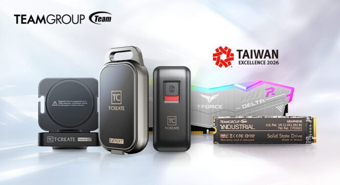 Team Group Inc., líder mundial en memorias, anunció hoy que cinco de sus productos de las marcas T-FORCE, T-CREATE y TEAMGROUP INDUSTRIAL han sido galardonados con los Premios a la Excelencia de Taiwán 2026, destacándose entre numerosas candidaturas y obteniendo un notable reconocimiento. Los productos premiados incluyen la memoria de escritorio T-FORCE DELTA RGB ECO DDR5, la unidad SSD externa T-CREATE EXPERT P34F Find My, la unidad SSD externa T-CREATE EXPERT P35S Destroyed, la unidad SSD externa T-CREATE CinemaPr P36D Docking y la unidad SSD M.2 TEAMGROUP INDUSTRIAL P250Q. Estos galardones demuestran la sólida capacidad de innovación e I+D de TEAMGROUP y marcan un nuevo hito para la marca.