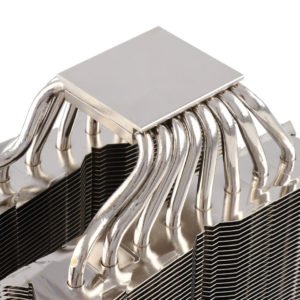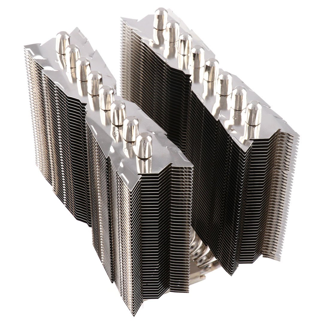 El calor extraído de una base de cobre niquelado con acabado de espejo más pesado se transporta a las pilas de aletas mediante ocho tubos de calor de 6 mm de espesor. El espléndido uso del cobre pesado utilizado en este disipador térmico hace que incline la balanza a 850 g, sin ventiladores. Con los dos ventiladores instalados, el Silver Arrow IB-E Extreme Rev. B puede manejar cargas térmicas de hasta 320W. Cada uno de los dos ventiladores TY-143 140 mm incluidos gira entre 600 y 2.500 RPM, empujando 31.4 a 130 CFM de aire, con una salida de ruido que oscila entre 21 y 45 dBA. Thermalright ha actualizado la compatibilidad con el zócalo de la CPU para incluir AM4 y LGA2066, además de LGA115x y LGA2011 (v3). El disipador de calor mide 155 mm x 130 mm x 163 mm (LxWxH). La compañía no reveló precios.