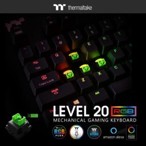 Construido con una placa superior de aluminio de primera calidad y un diseño de tapa flotante, el Razer Green Gaming Keyboard de Nivel 20 RGB ofrece 16.8 millones de verdadera iluminación de color RGB en las zonas RGB de los lados frontal y de los 3 lados, brindando 13 efectos de iluminación dinámicos masivos (frente lateral) y 14 efectos de iluminación dinámicos (cara lateral) del color para una experiencia RGB verdaderamente personalizada. Es compatible con todas las líneas de productos Thermaltake TT RGB PLUS, enfriamiento por líquido, ventilador de caja y tiras de LED, lo que permite a los entusiastas sincronizar todos los colores RGB a todas las líneas de productos compatibles con Thermaltake para una coordinación de color aún mayor. Además, el teclado para juegos RGB de nivel 20 viene con una aplicación de teléfono inteligente / tableta de diseño exclusivo que cuenta con una serie de funciones únicas que incluyen: Control de voz AI para el acceso a funciones de luz y macros esenciales.