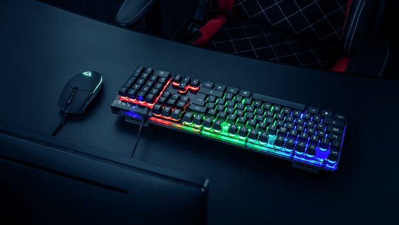 El teclado incluido en el kit ofrece un diseño de disposición completa, y soporta anti-ghosting de hasta 8 teclas, un botón “Modo de juego” que permite deshabilitar la tecla de Windows para evitar salir por accidente de nuestra partida, pies de goma antideslizante con dos alturas regulables, 12 teclas para funciones multimedia, y por supuesto que incluye iluminación RGB. Este teclado puede conseguirse tanto del kit “Azor GXT 838” como por separado bajo el nombre “Azor GXT 835”.