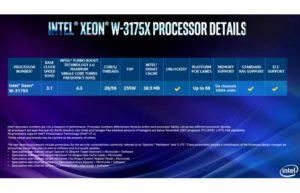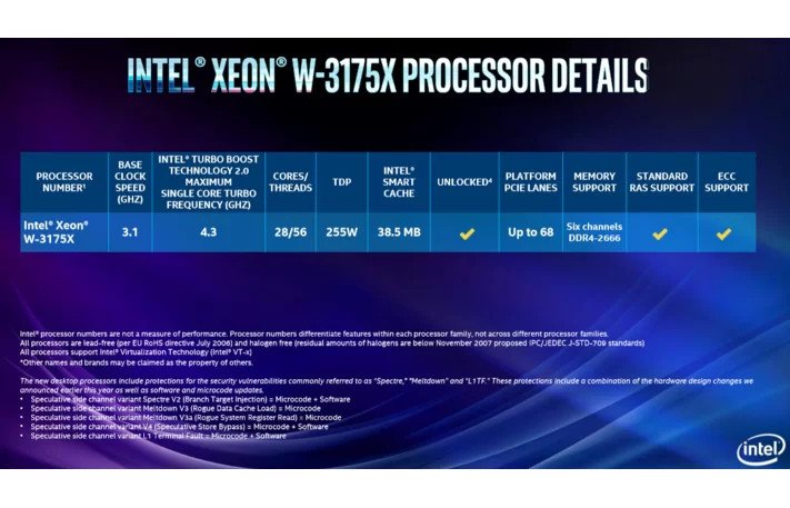 El Xeon W-3175X se basa en las líneas de fabricación de 14 nm ++ de Intel, cuenta con 28 núcleos físicos con HyperThreading, cuenta con relojes base / boost de 3.1 / 4.3 GHz respectivamente, admite memoria DDR4 de hexa-canales y ofrece 44 líneas PCIe. También tiene un TDP de 255 W. Compare estas especificaciones con el Threadripper 2990WX de AMD con sus 32 físicos, 64 núcleos lógicos, compatibilidad con DDR4 de cuatro canales, 64 líneas PCIe, 250 W TDP. A esto hay que agregar el costo de la plataforma para uno de estos bebés de Intel, con una placa base LGA3647 de 3,647 pines (algunos cuentan con los sistemas de suministro de energía más ridículos que pueda imaginar, por cierto, en 32 fases) .. con el requisito de 4x ocho pines Conectores de alimentación EPS y conectores 2x 24-pin.