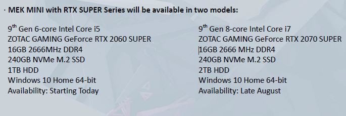 La tecnología ZOTAC, un fabricante global de innovación, hace que la computadora de escritorio para juegos súper compacta, MEK MINI, sea aún más poderosa. Con solo 9,18 litros, MEK MINI incluye un procesador Intel Core i7 de novena generación de 8 núcleos y una tarjeta gráfica discreta ZOTAC GAMING GeForce RTX SUPER.
